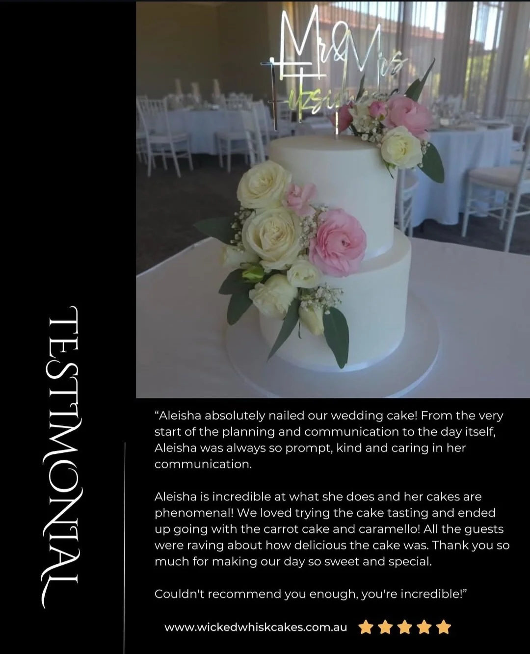 ''Whether it’s something stunningly traditional or elegantly unique, at Wicked Whisk we aim to create the perfect cake that will leave your mind at ease and your mouth watering. With more than 18 years of industry experience, our passion for cakes, as well as a family history of cake making, you can be sure Wicked Whisk will create a centrepiece to be remembered and savoured right down to the last bite.